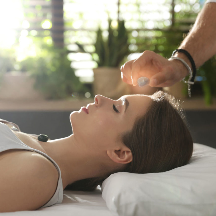 La lithothérapie, avec la pose de cristaux soigneusement choisis sur vos chakras, qui diffusent leur vibration propre pour résonner avec vos besoins énergétiques.